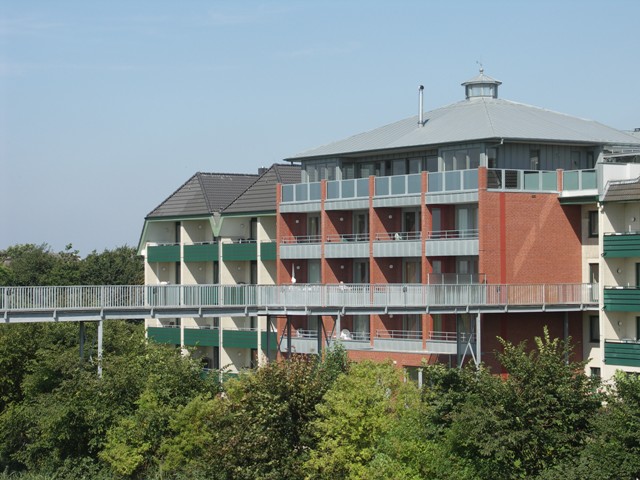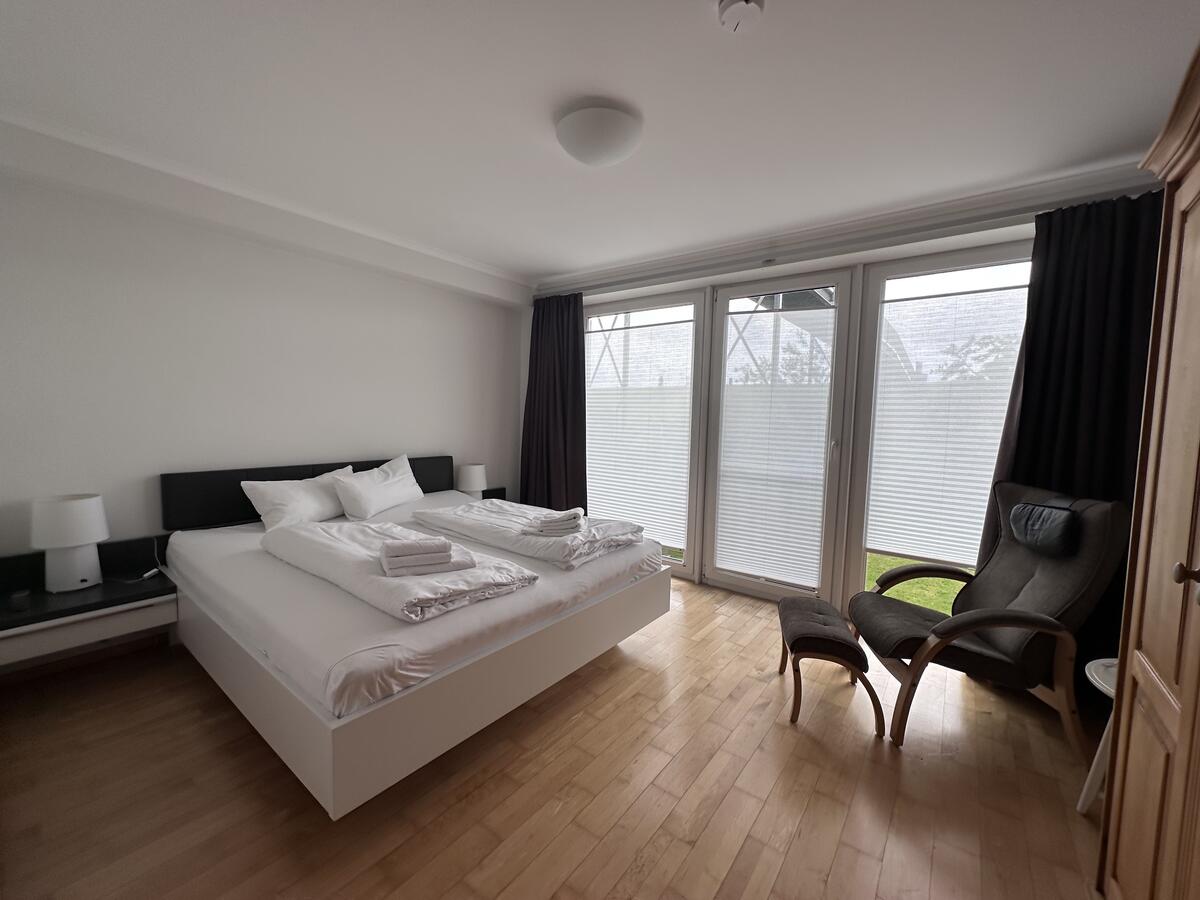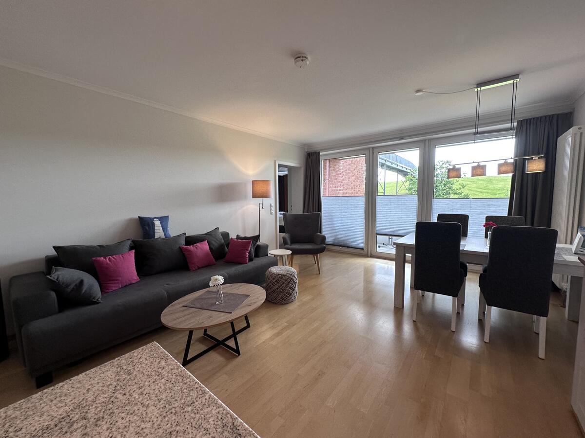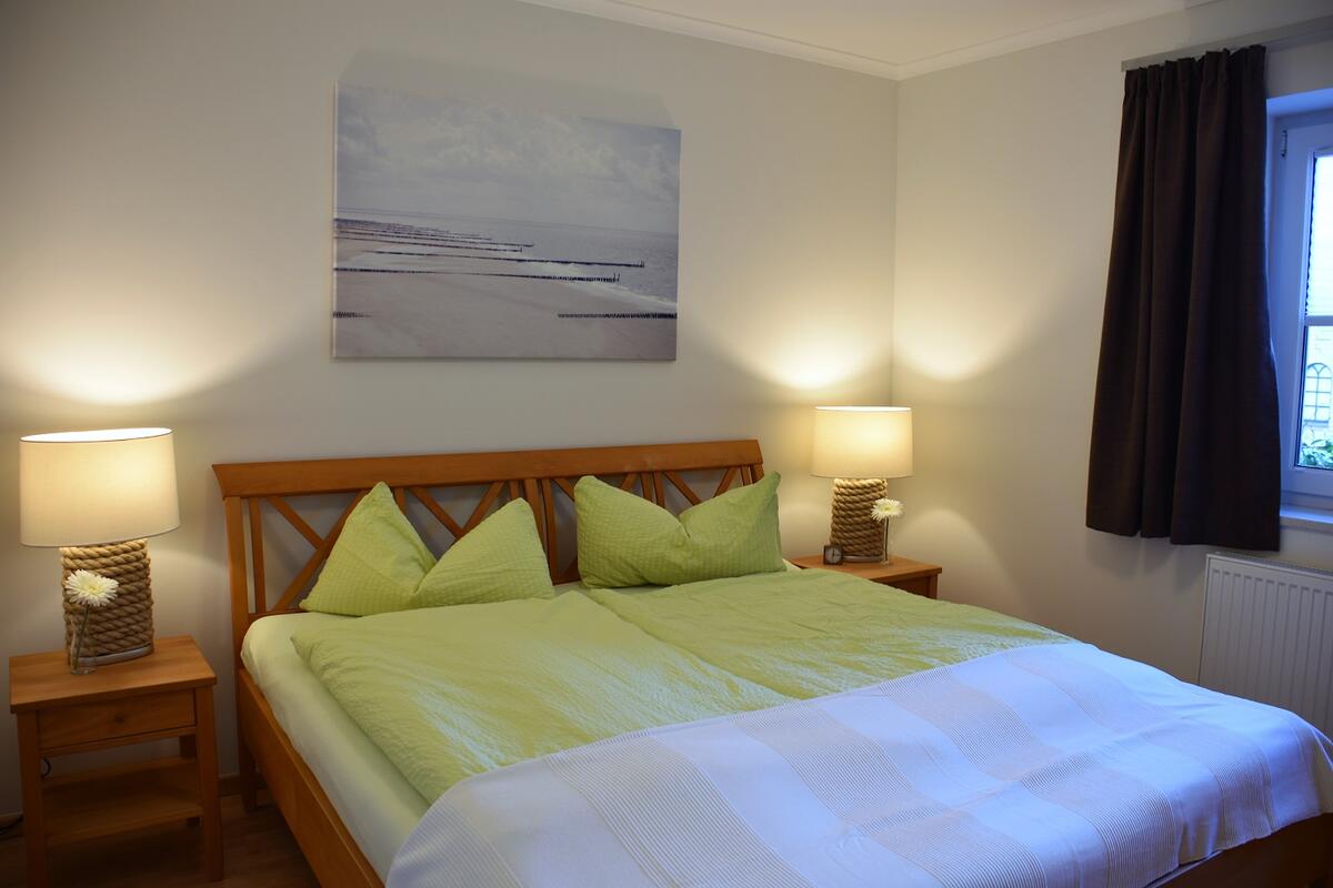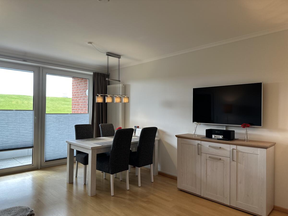 Auf den 75 m² der Wohnung »Kapitän«, mit zwei Schlafzimmern (mit sehr rückenfreundlichen Doppelbetten), zwei Bädern (Duschbad mit ebenerdiger Dusche und Badewannenbad), einem lichtdurchfluteten Wohnbereich mit integrierter Küchenzeile, Balkon (Blick in den Garten und auf den Deich), finden 4 Personen komfortabel Platz.