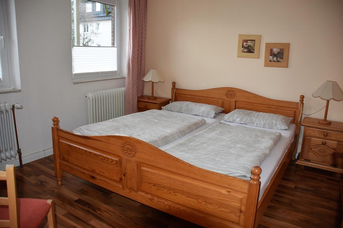 Schlafzimmer mit Doppelbett und Kleiderschrank.