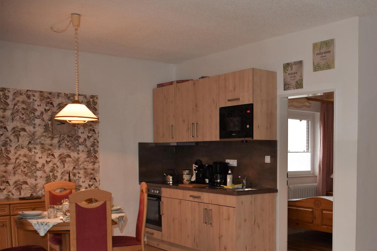 Küchenzeile bestehend aus Kochfeld, Backofen, Spülbecken, Kühlschrank mit Eisfach, Kaffeemaschine. Bestecke und Geschirr für den täglichen Bedarf sind natürlich vorhanden.