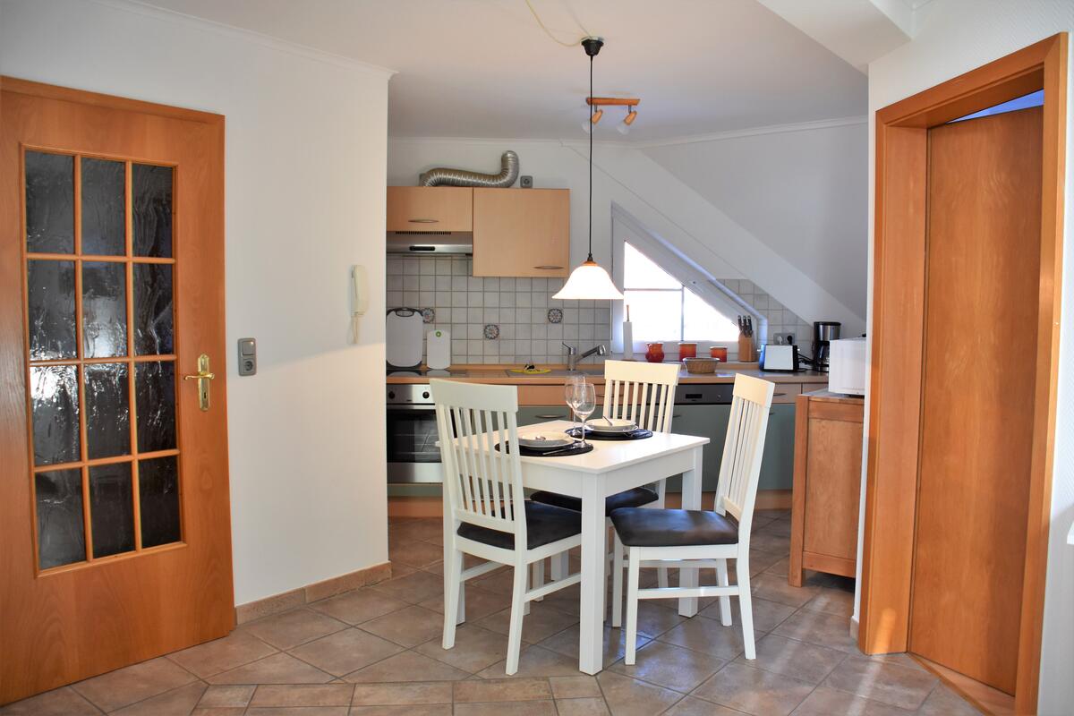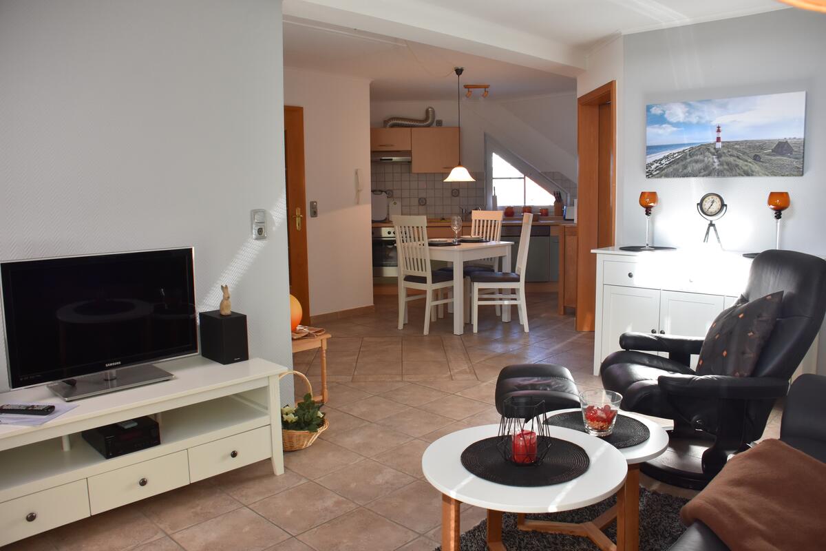 Unsere gemütliche 2-Zimmer-Wohnung im 2. Obergeschoss bietet auf ca. 50 qm ausreichend Platz für 2 bis 3 Personen, um die Seele baumeln zu lassen. Das Wohnzimmer verfügt über ein Schlafsofa (für 1 Person), zwei Relax Stühle mit Fußhockern und einen Flachbild-TV. Die Küchenzeile ist komplett ausgestattet, inklusive Geschirrspüler. Im Schlafzimmer mit Doppelbett (1,80x2 m) sorgt ein zweiter TV für Unterhaltung. Das Tageslichtbad bietet eine bodentiefe Dusche, Waschbecken, WC und Bidet. Auf dem Balkon können Sie die Sonne genießen. Ein fester PKW-Stellplatz ist vorhanden.