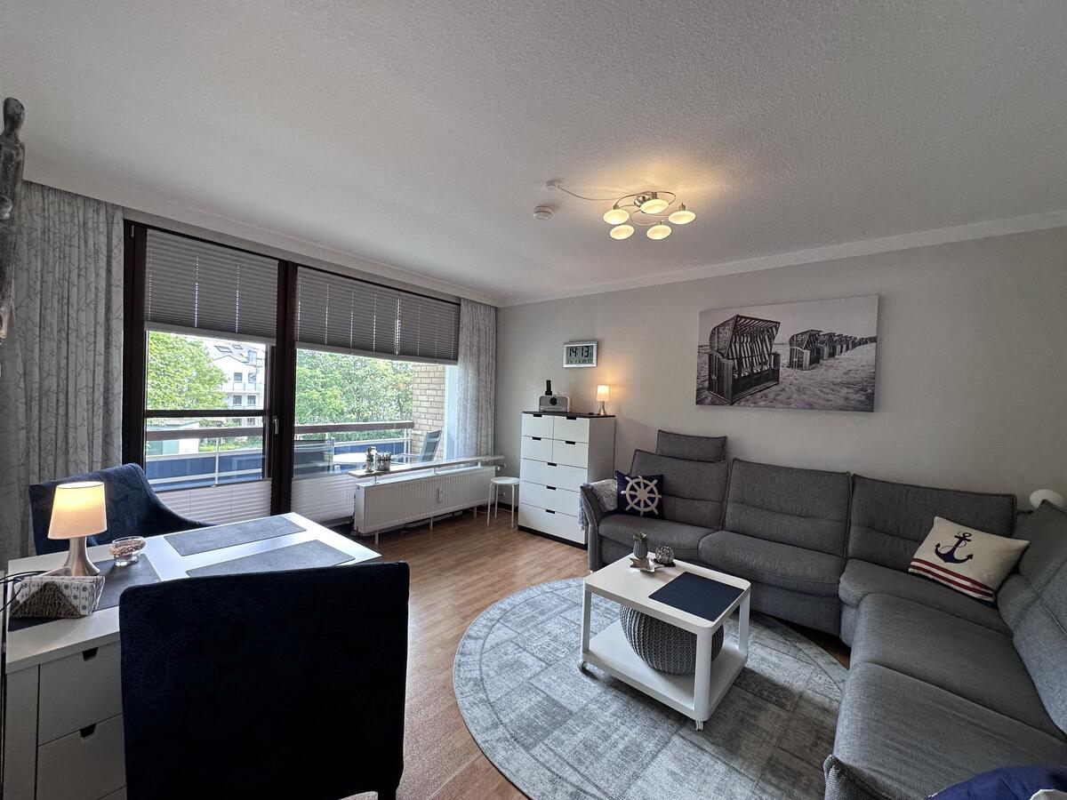 Das großzügige Wohnzimmer bietet viel Platz, ausgestattet mit einer gemütlichen Wohnlandschaft (Schlafcouch, Liegefläche 120x200cm), Smart-TV und einem direktem Zugang zum möbliertem Balkon, der sich ideal für entspannte Stunden im Freien eignet.