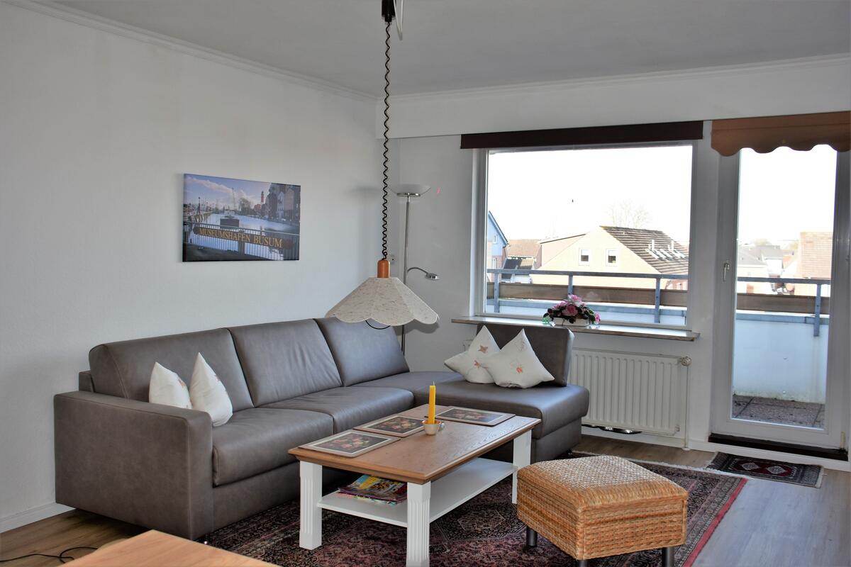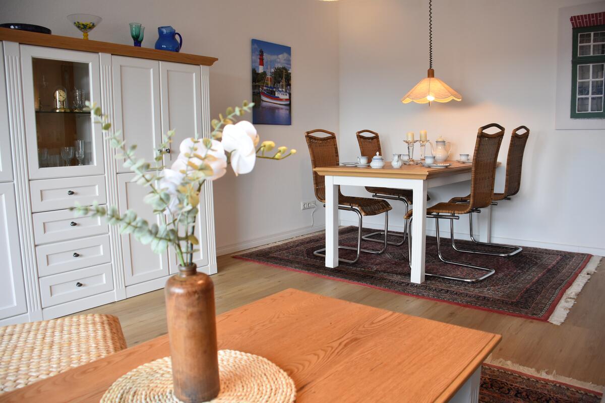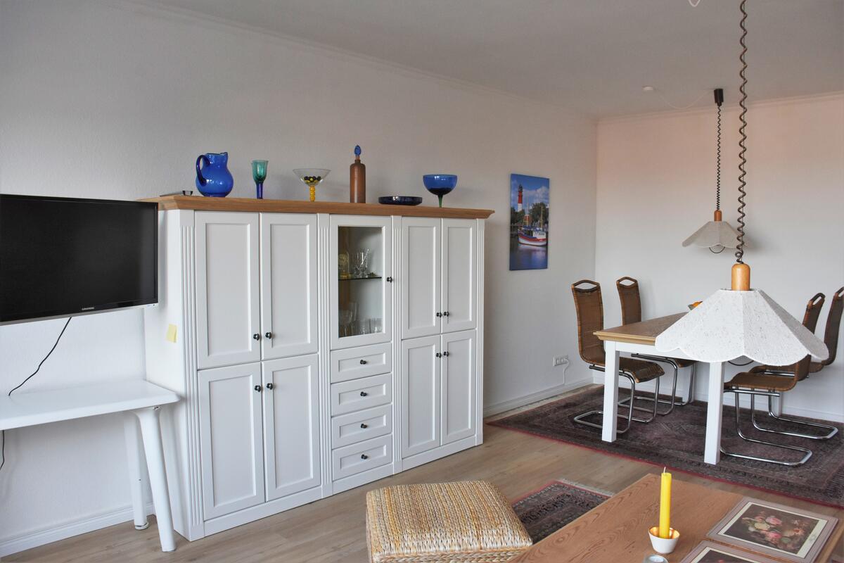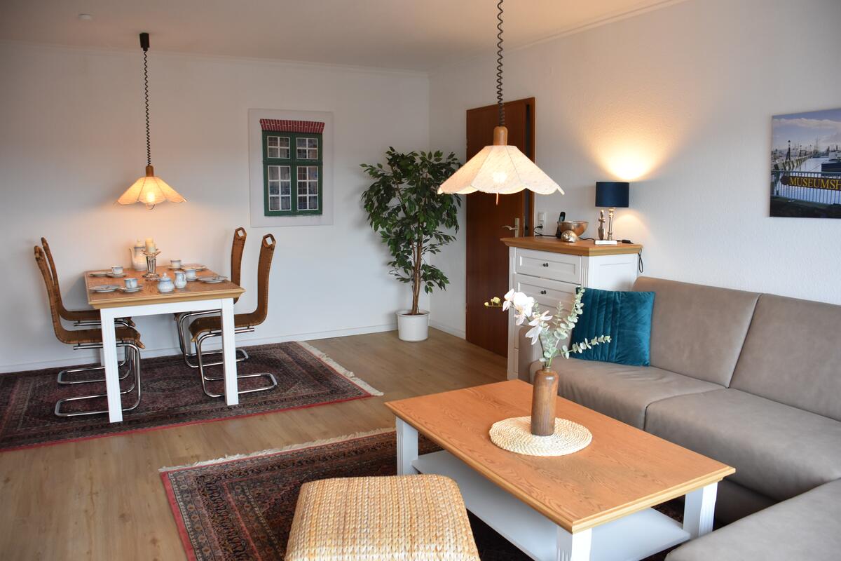 Die ausziehbare Couchgarnitur im Wohnzimmer bietet Schlafplatz für die 3. und 4. Person. Selbstverständlich verfügt die Wohnung über Kabelfernsehen. Im Wohnzimmer befindet sich zudem ein Esstisch mit Stühlen.