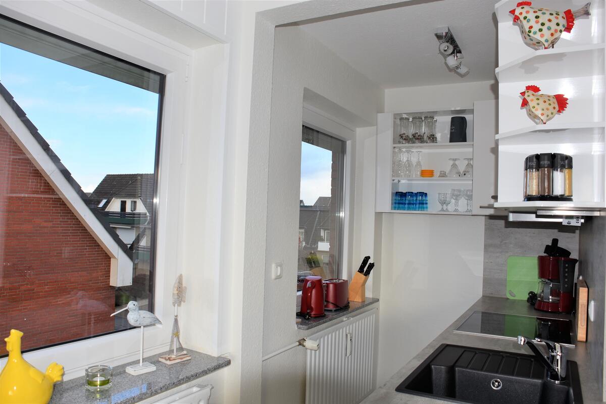 Die angrenzende Küchenzeile ist mit allen haushaltsüblichen Utensilien ausgestattet, inkl. Geschirrspüler.