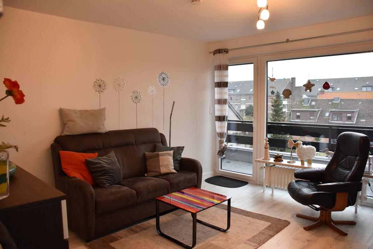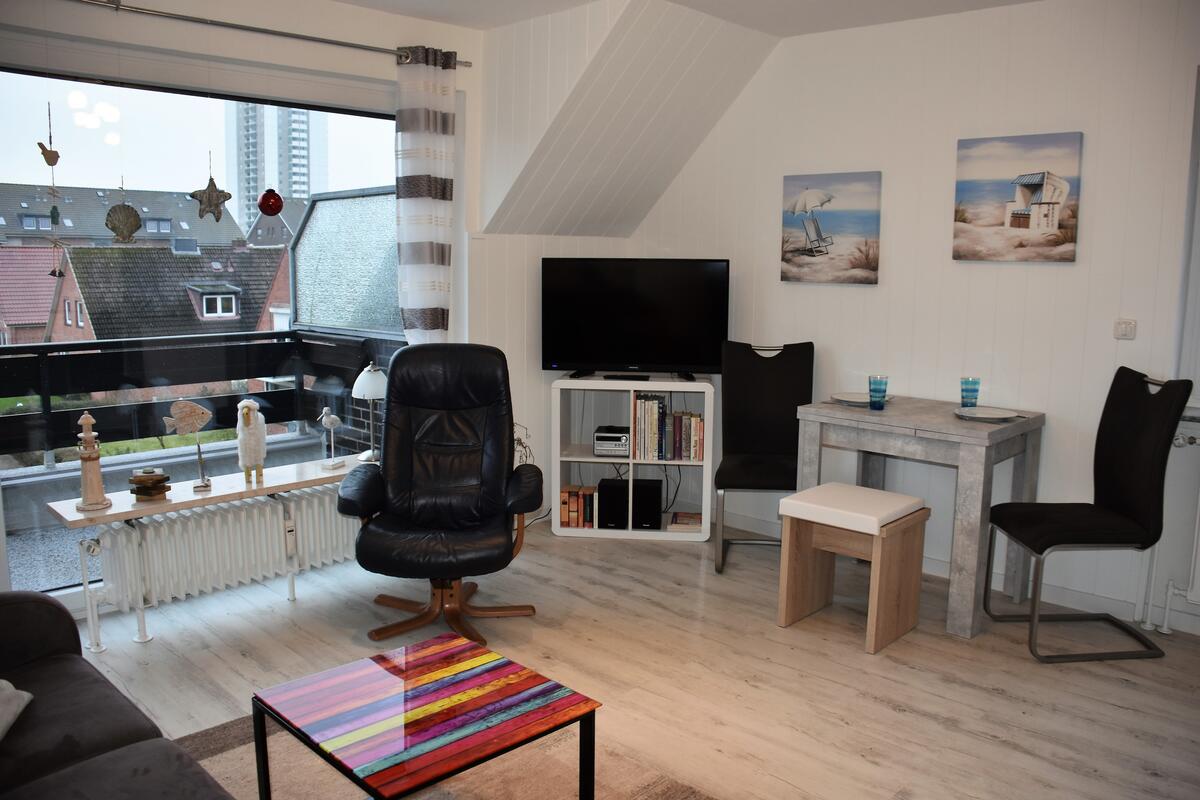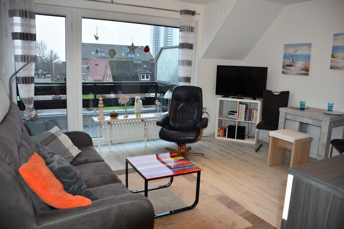 Das Wohnzimmer ist durch das große Balkonfenster angenehm hell. Ausgestattet ist es mit einem 3-Sitzer, einem Sessel, Flachbild-TV, sowie einer Stereoanlage.