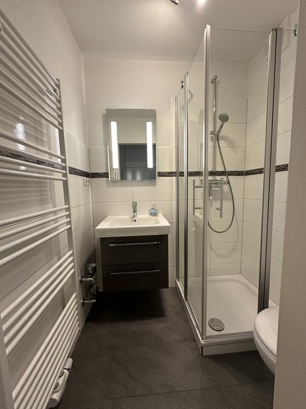 Das Bad ist hell und freundlich mit einer Dusche, Waschtisch mit geräumigen Unterschrank und WC.