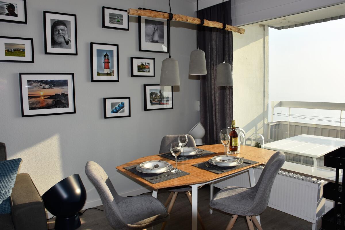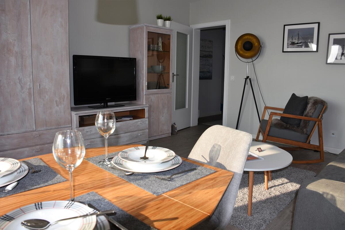 Das lichtdurchflutete Wohnzimmer ist mit hellen Möbeln und passenden Accessoires ausgestattet. Entspannen Sie auf dem gemütlichem Sofa (Schlafsofa) bei einem guten Film oder genießen Sie ein ausgewogenes Frühstück mit Blick auf das Meer.
