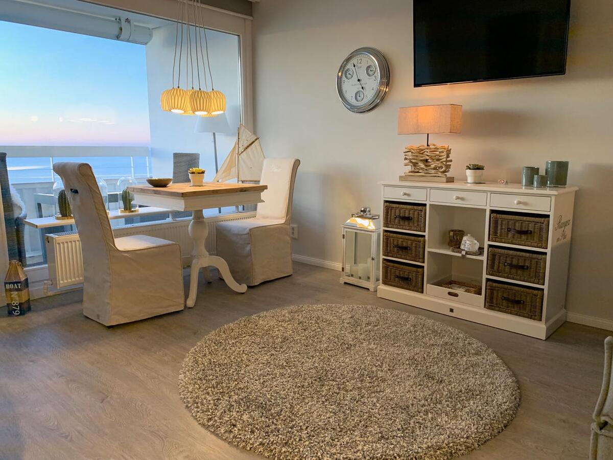 Der Wohn-/Schlafraum ist mit hochwertigen Möbeln ausgestattet. Ein großes Boxspringbett (180x200 cm) bietet genügend Platz zum Erholen. Genießen Sie einen traumhaften Ausblick auf die Nordsee während des Frühstücks oder Abendessen.