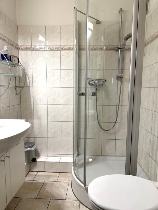 Das Badezimmer ist hell gefliest und mit Dusche und WC funktional ausgestattet.