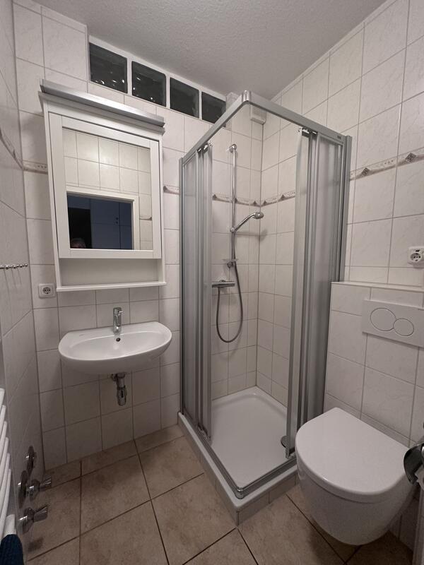 Das Bad ist funktionel mit Duschkabine, Waschbecken und WC.