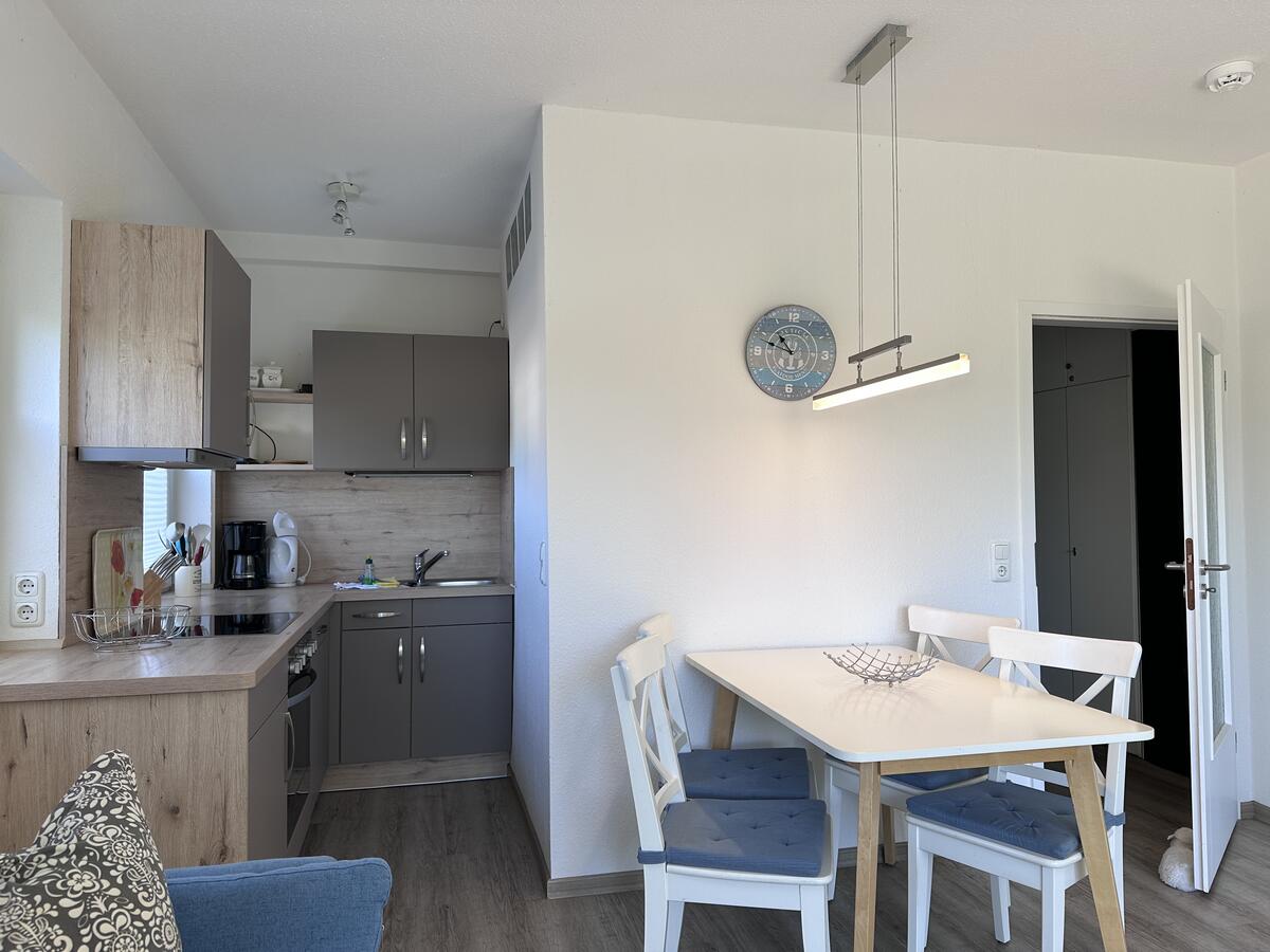 Das helle und freundliche Wohnzimmer ist ausgestattet mit einem Sofa, einem Flachbild-TV und Essplatz. Die angrenzende Küchenzeile bietet alles was Sie zum Kochen benötigen, inkl. Geschirrspüler.