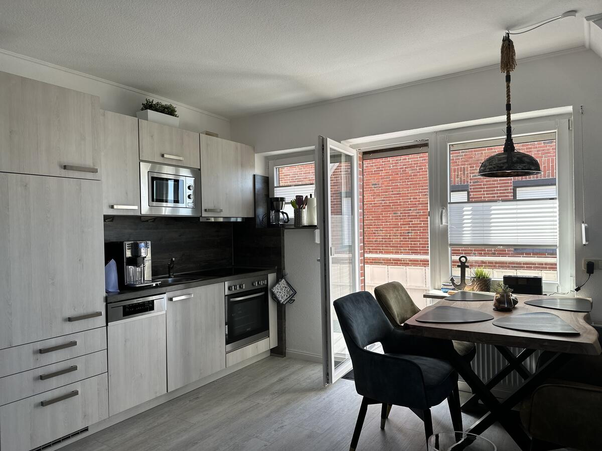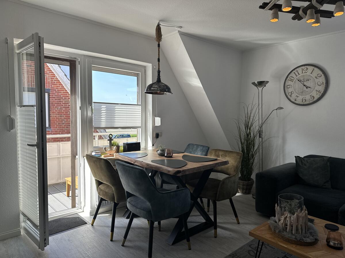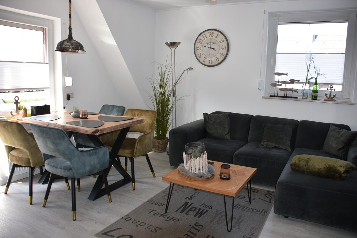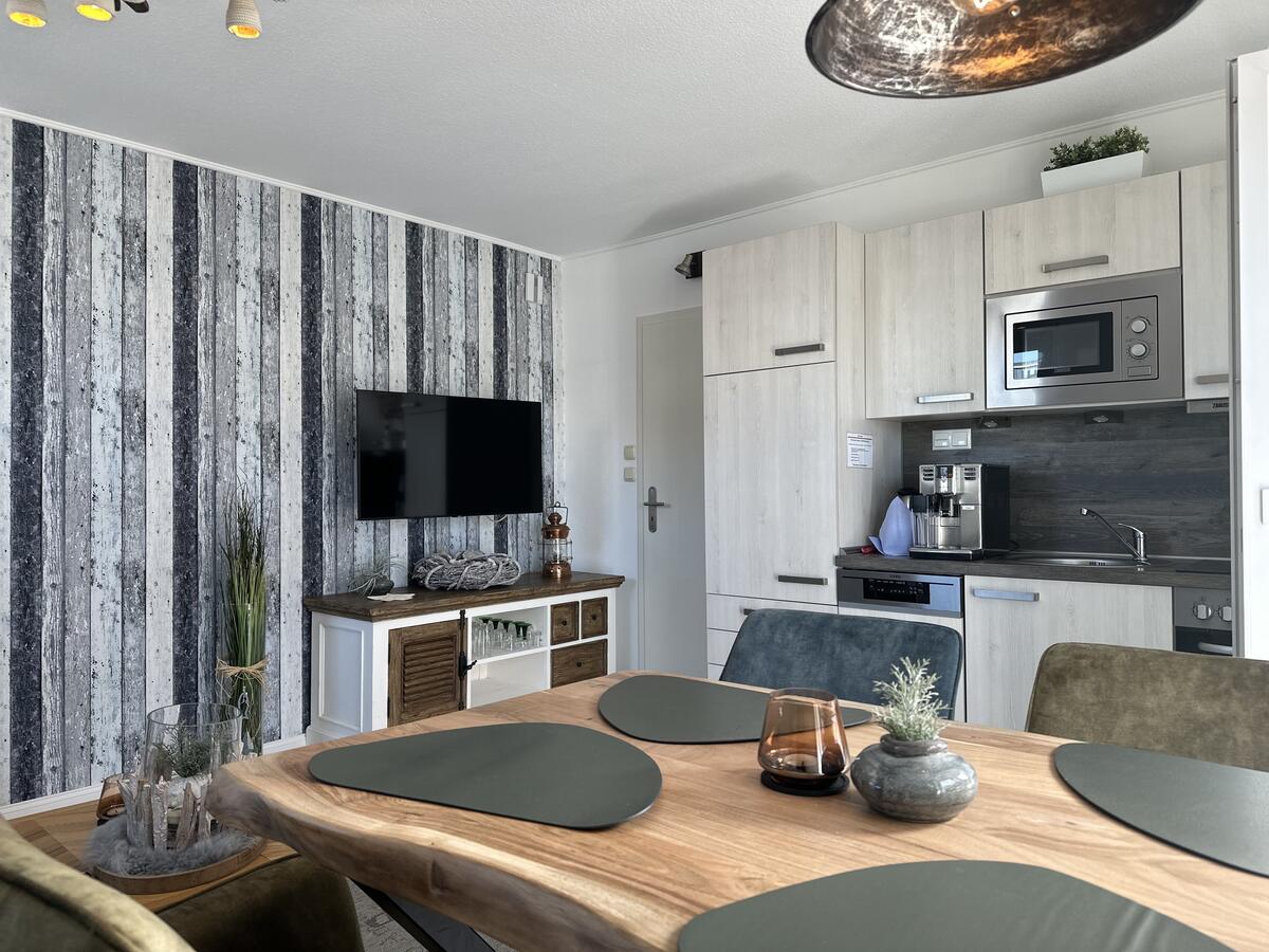 Das gemütliche Wohnzimmer mit offener Küche lädt dazu ein, auch längere Aufenthalte angenehm zu verbringen. Zur Ausstattung zählen eine Couchgarnitur, ein Flachbildfernseher sowie eine Essecke.