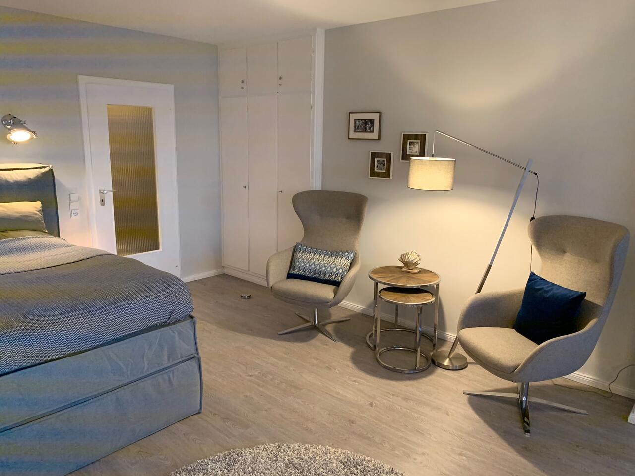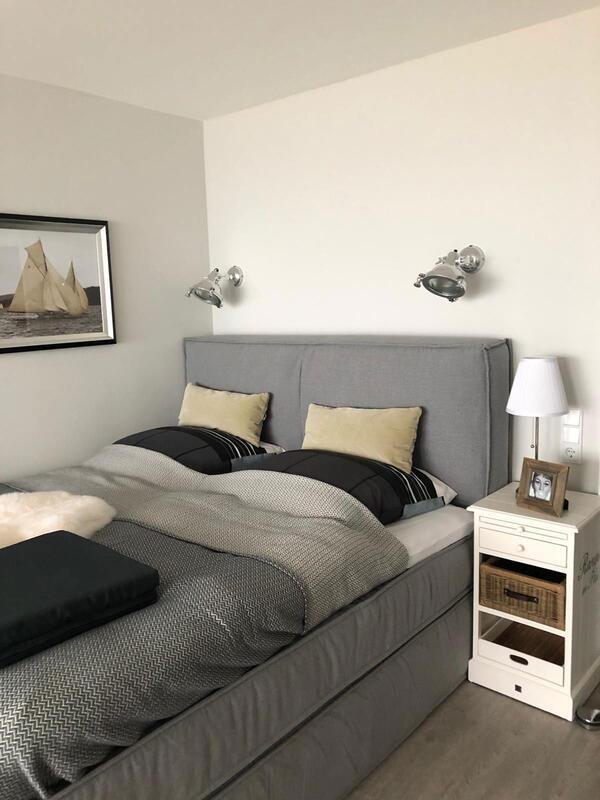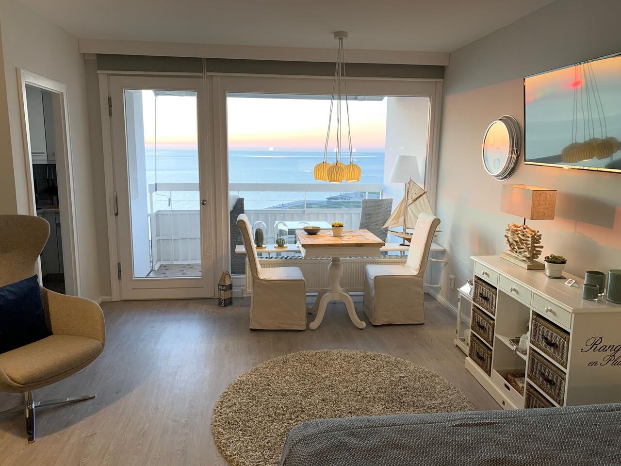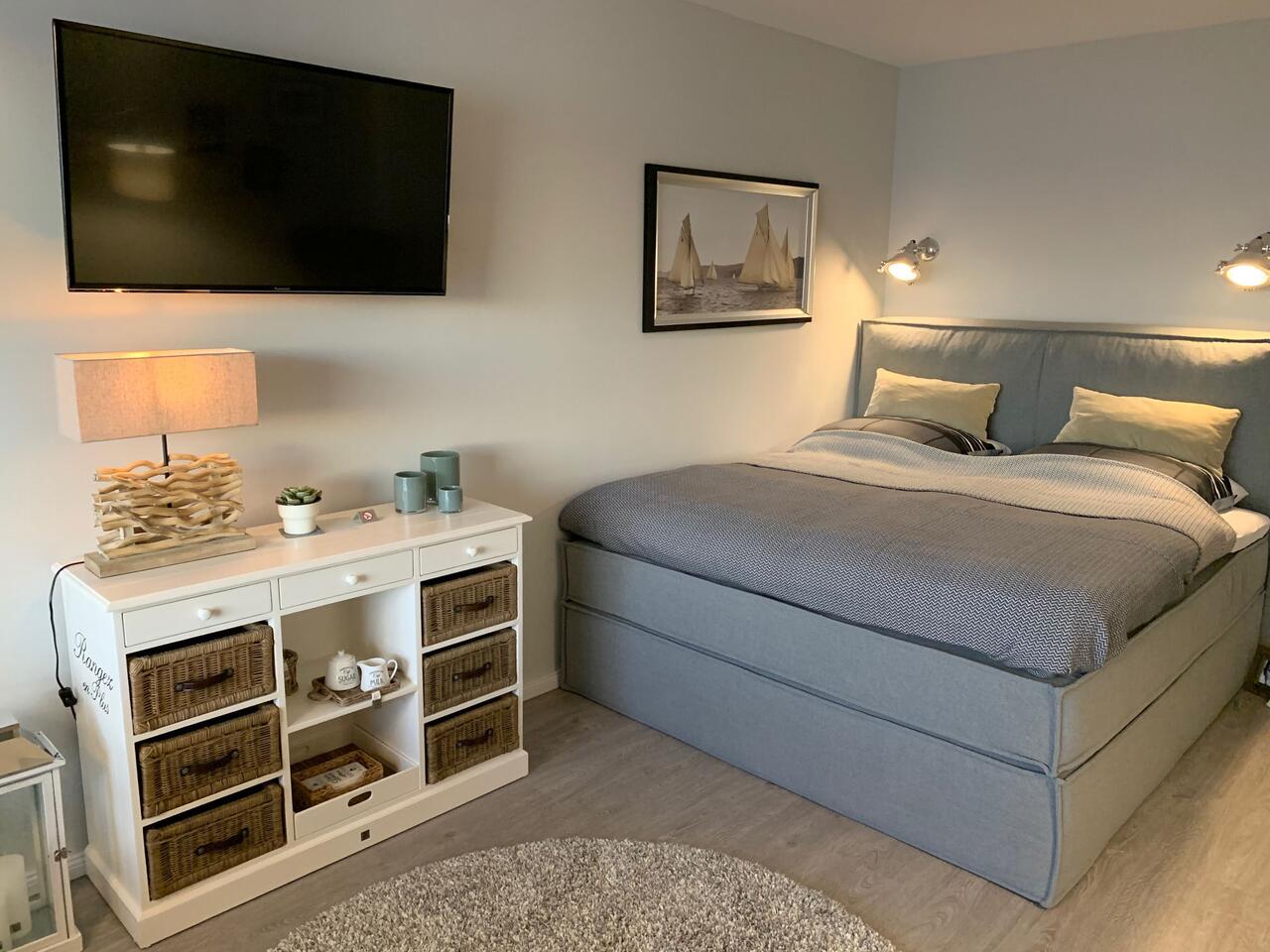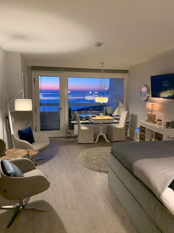 Der Wohn-/Schlafraum ist mit hochwertigen Möbeln ausgestattet. Ein großes Boxspringbett (180x200 cm) bietet genügend Platz zum Erholen. Genießen Sie einen traumhaften Ausblick auf die Nordsee während des Frühstücks oder Abendessen.