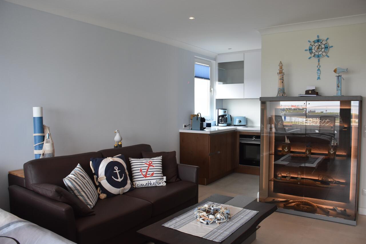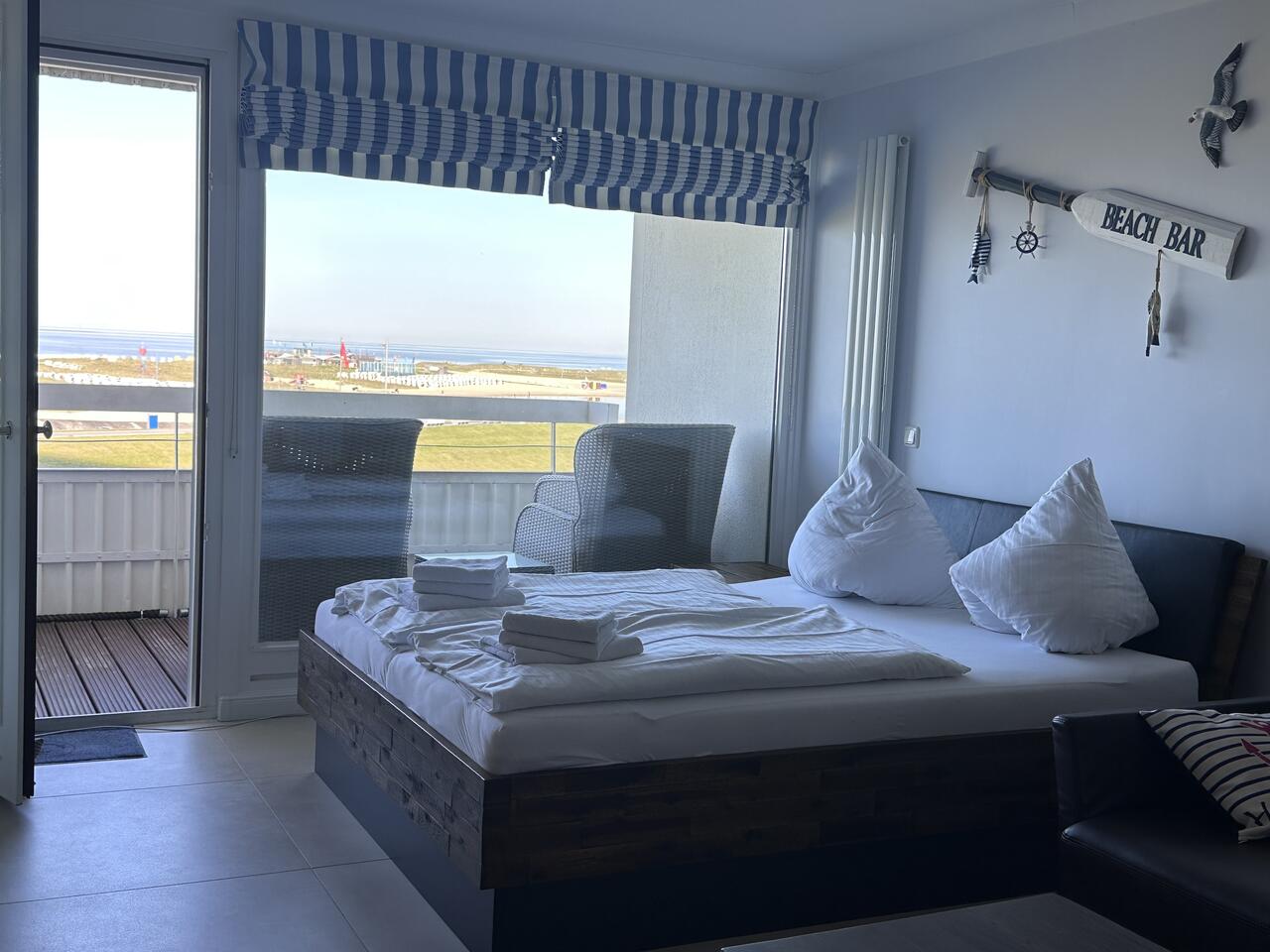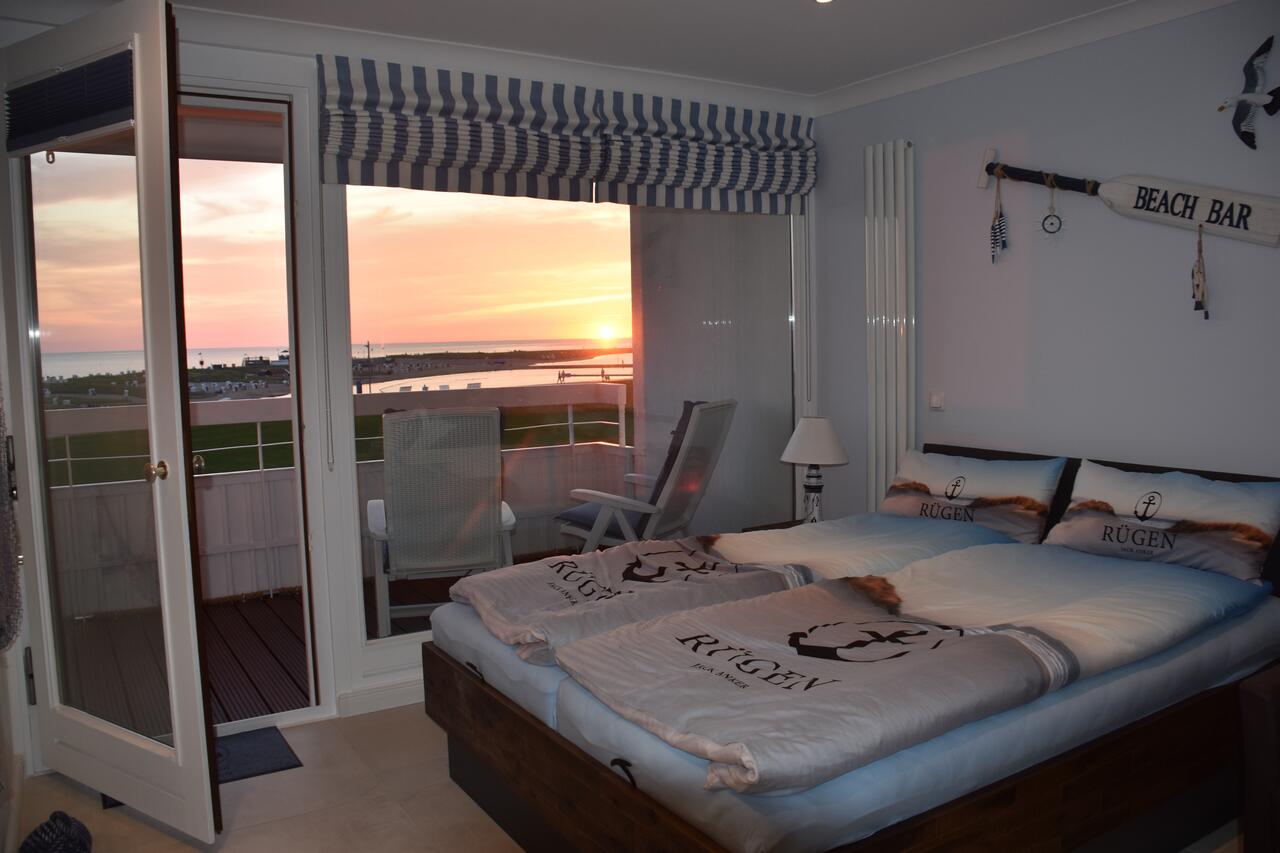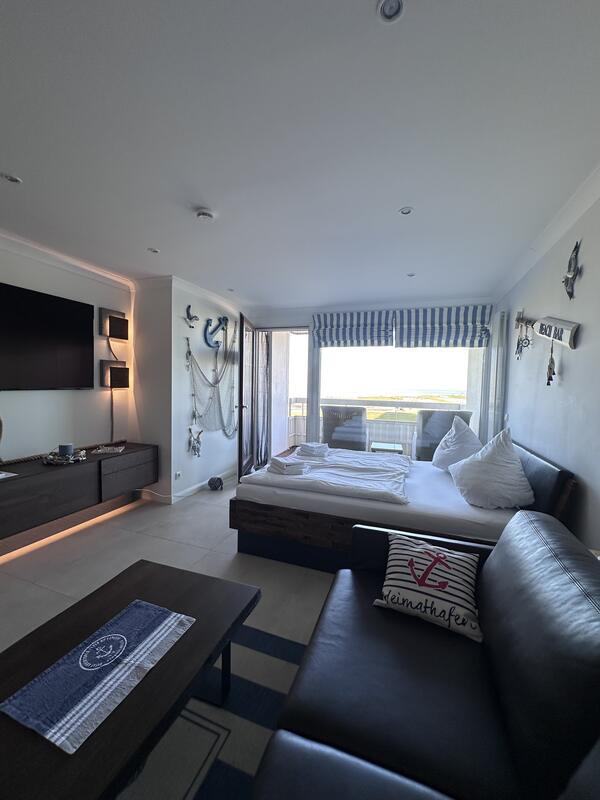 Der offene Wohn-/Schlafbereich mit feststehendem Bett ist der perfekte Erholungsplatz für Sie. Egal ob vom Sofa oder vom Bett, Sie können abends gemütlich einen Film gucken oder Netflix (mit eigenem Account) streamen oder Sie genießen einfach den traumhaften Ausblick auf das Meer und die Perlebucht.