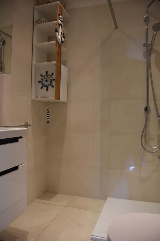 Das Bad ist ausgestattet mit einer Rainshower-Dusche, Waschbecken und WC.