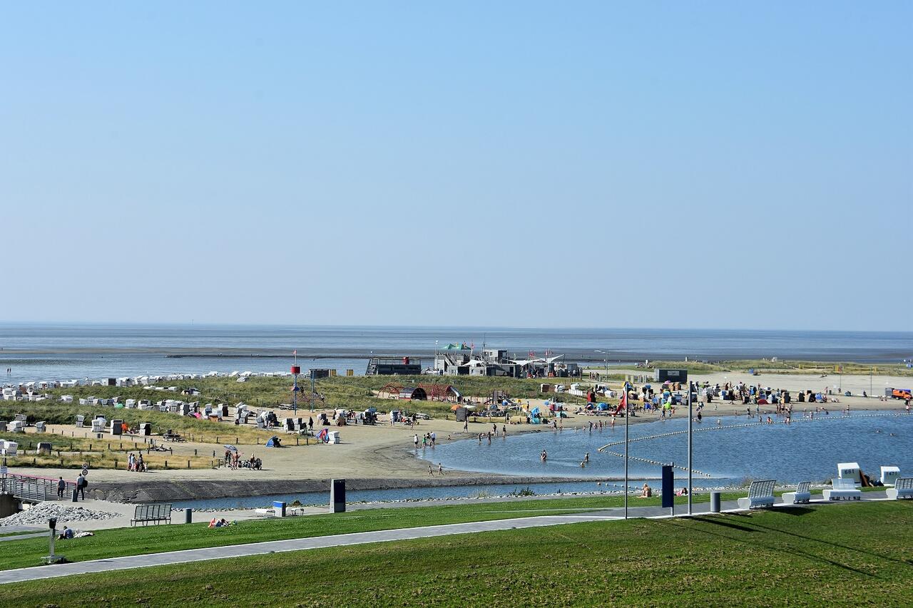 Sie bietet auf ca. 40 qm genügend Platz für 2 Personen. Der helle freundliche kombinierte Wohn-/ Schlafraum ist mit einem Sofa mit Schlaffunktion mit Matratze und Lattenrost eingerichtet. Die Liegeffäche ist 1,60 m x 2,00 m. Flachbildfernseher, und Essplatz mit Blick zur Familienlagune.