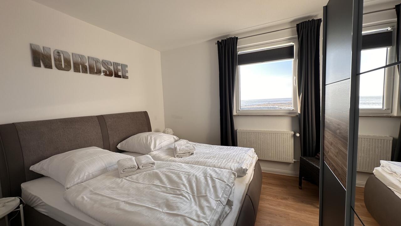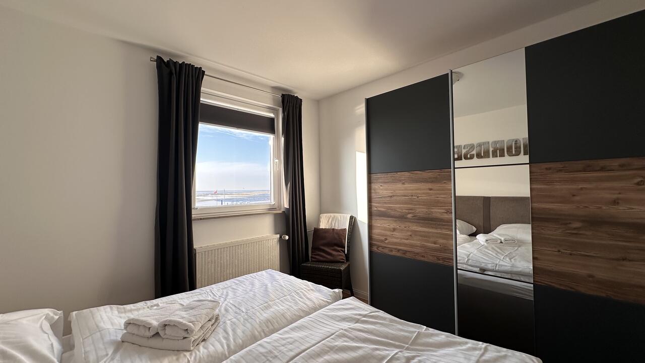 Das Schlafzimmer bietet eine kleine Traumoase mit eingebautem Kleiderschrank mit viel Stauraum und einem Doppelbett.
