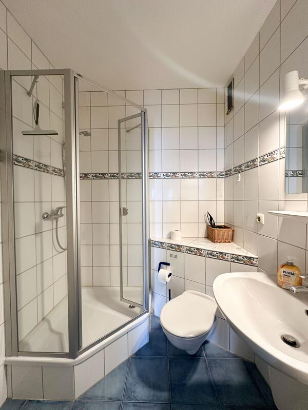 Das Bad ist hell und mit einer Runddusche, Waschbecken und WC eingerichtet.